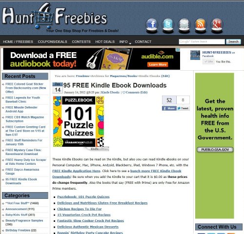 Hunt4Freebies, Hunt4Freebies is a Freebies/Deals website. You can find FREE Kindle ebooks, Product samples and much more free stuff found on the web. You can also find printable coupons and many money saving deals. We are updated 24/7.